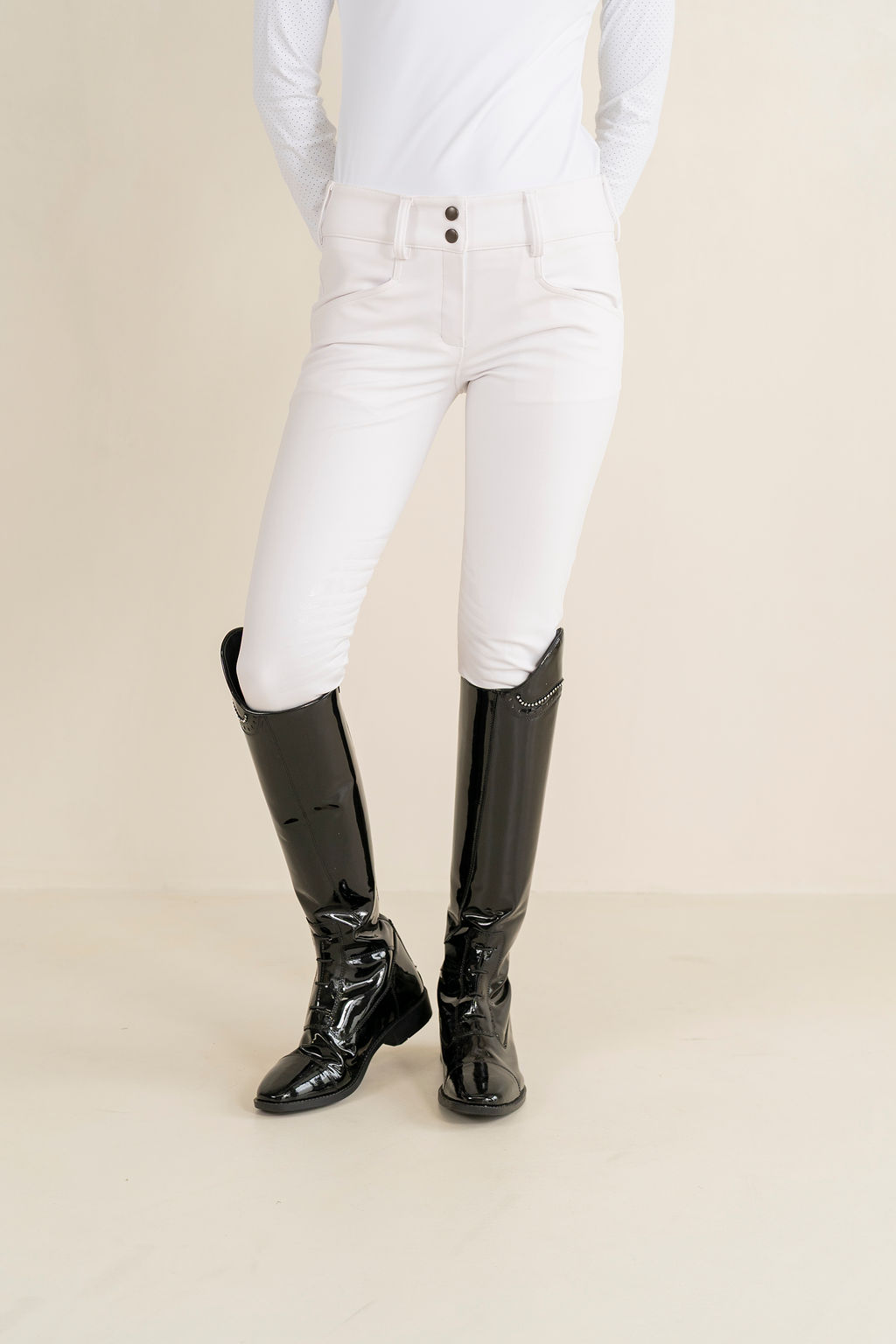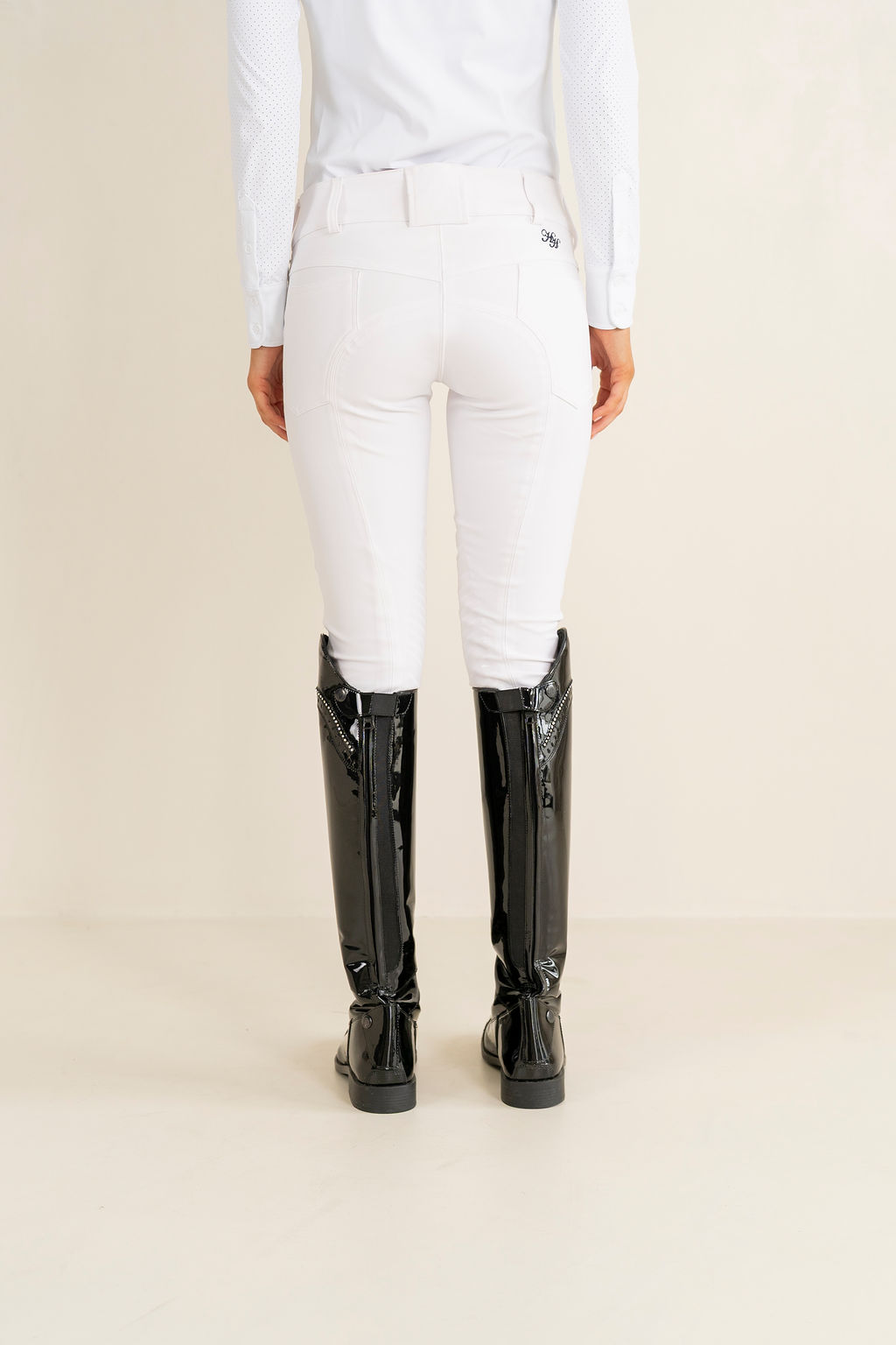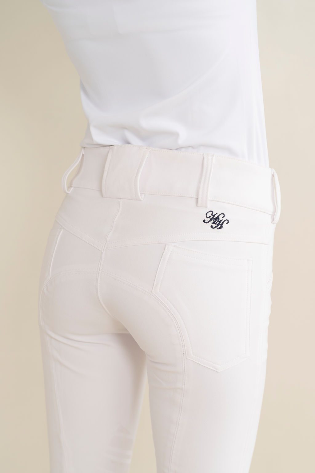 These stunning new white coolmax breeches are your new favourites. With soft breathable waistband and inch and a half belt loops these new comfortable breeches will make you happy to wear them all day. White trim with discreet logo on the top rear side these breeches are great for in and out of the ring. Featuring a silicone knee grip, they are a classy look without too much stick. Pockets at the front and back these new breeches are a must have with any equestrian.